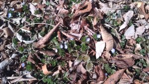 クン活を見守っていると、枯葉の中から小さな青いお花がちらほらと・・・